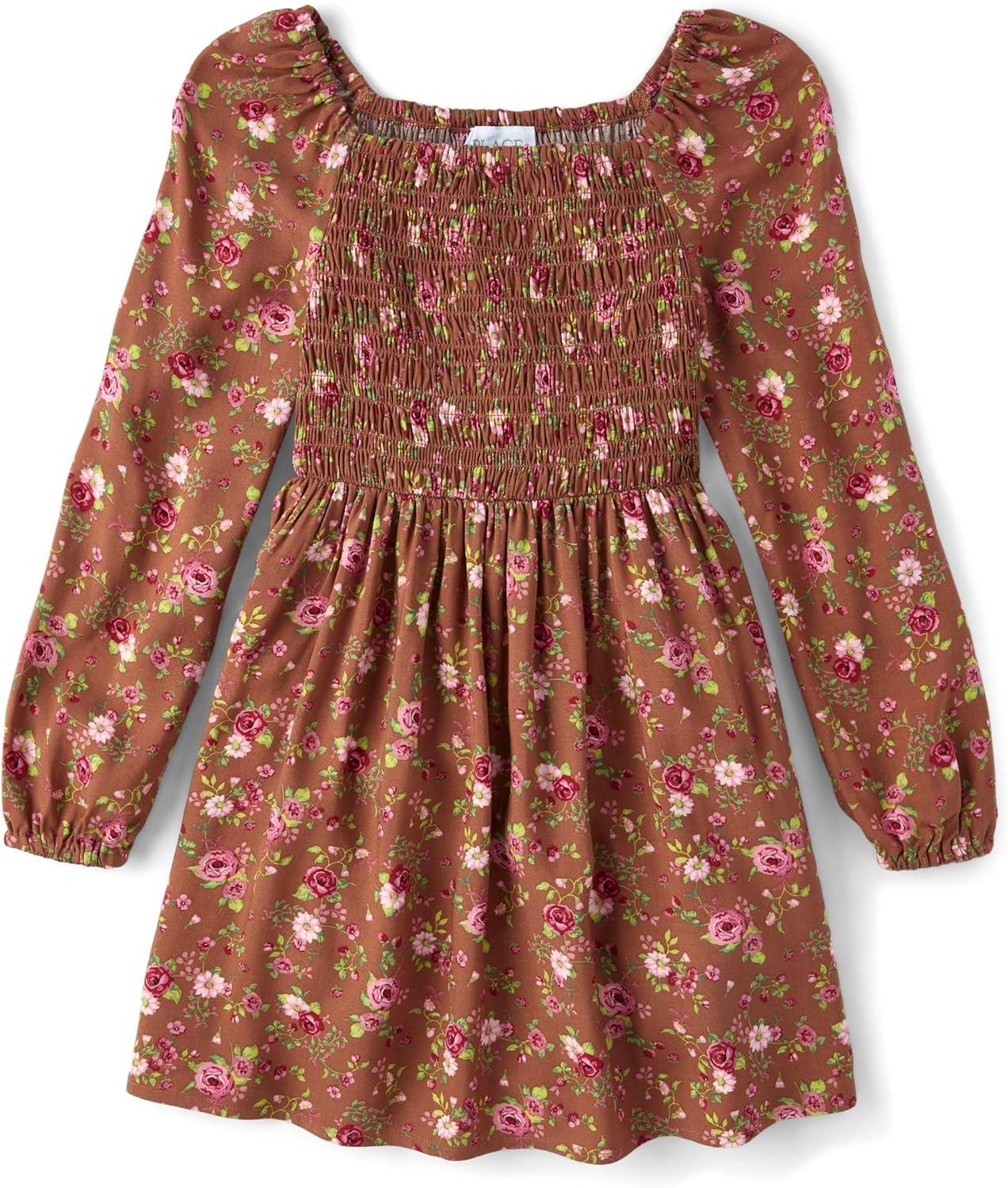The Children’s Place Big Girls’ Long Sleeve Casual Dress(Pecan Pie Smocked)